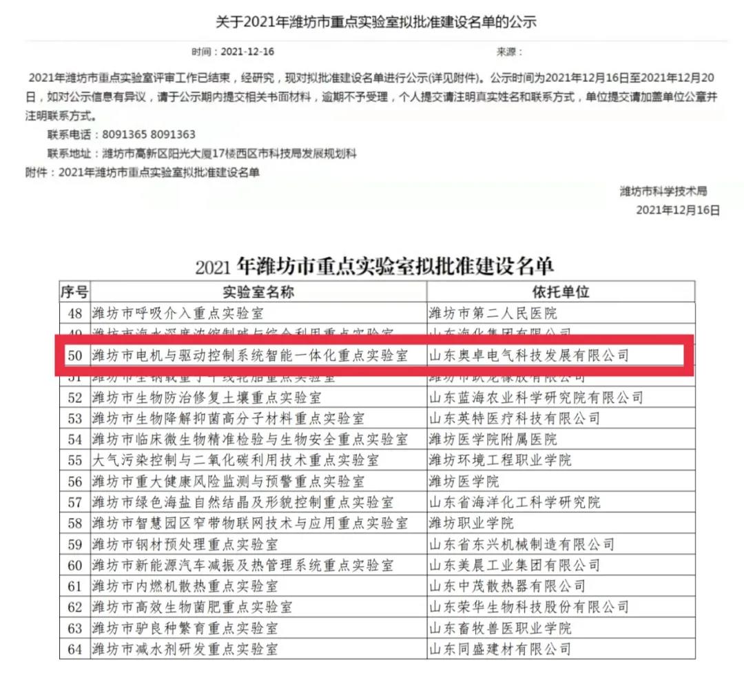 2021年12月21日,經(jīng)過濰坊市科學(xué)技術(shù)局關(guān)于2021年濰坊市重點實驗室批準建設(shè)名單的公示,山東奧卓電氣科技發(fā)展有限公司申報的“濰坊市電機與驅(qū)動控制系統(tǒng)智能一體化重點實驗室”榜上有名,成功獲批建設(shè)濰坊市重點實驗室。
