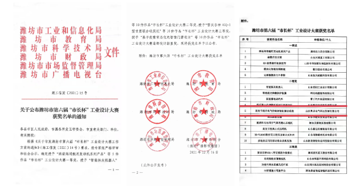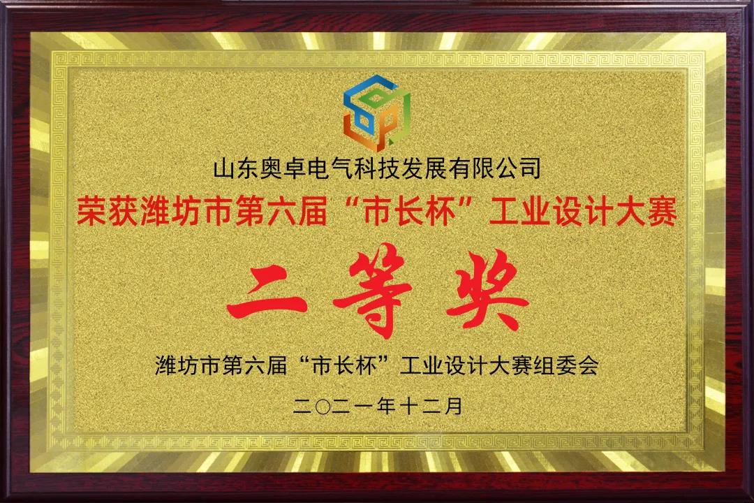 2021年12月28日,濰坊市第六屆“市長杯”工業(yè)設計大賽頒獎典禮在富華國際會議中心隆重舉行。山東奧卓電氣科技發(fā)展有限公司的參賽作品“高效節(jié)能的電氣控制智能化驅動系統(tǒng)”項目經過參賽作品征集和資格審查、作品評審及答辯、社會公示、展示點評等環(huán)節(jié)的層層篩選,在幾百件作品中脫穎而出,榮獲濰坊市第六屆“市長杯”工業(yè)設計大賽二等獎。等領導出席頒獎典禮并為獲獎單位頒獎。