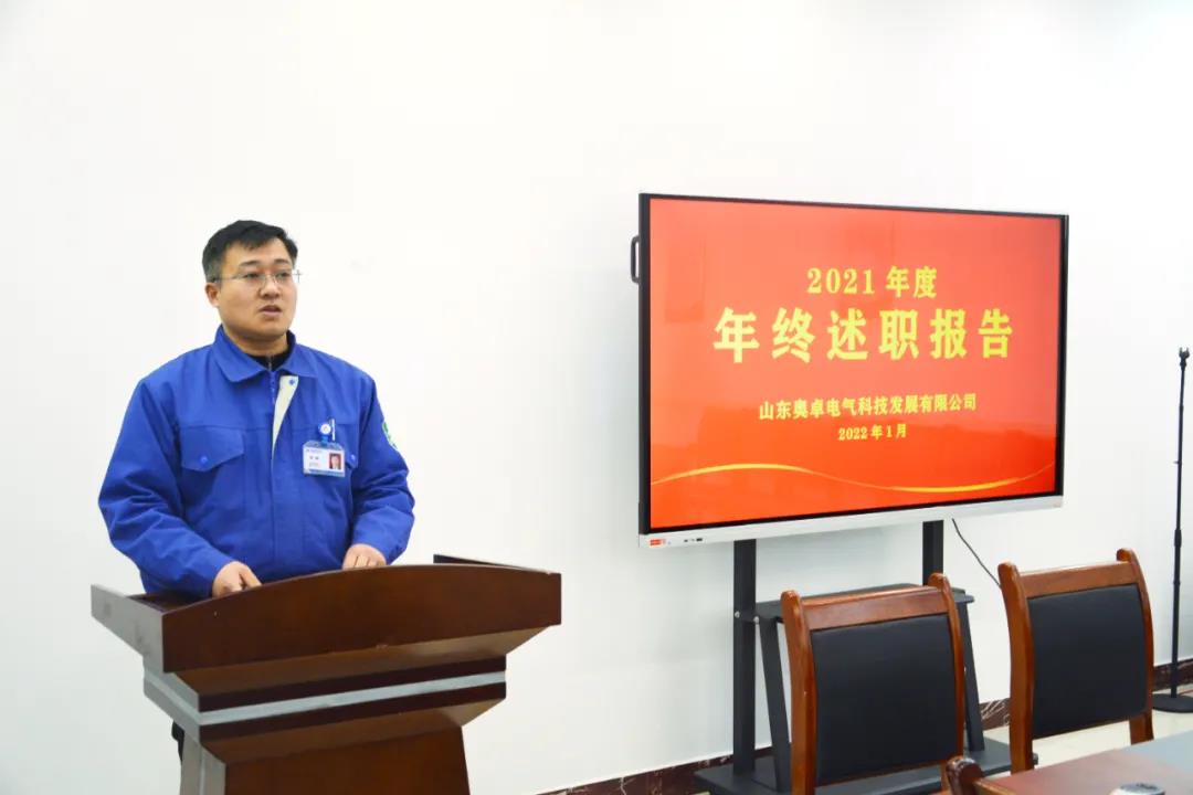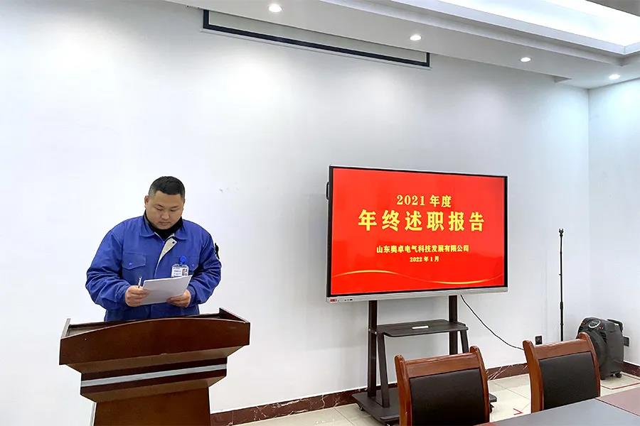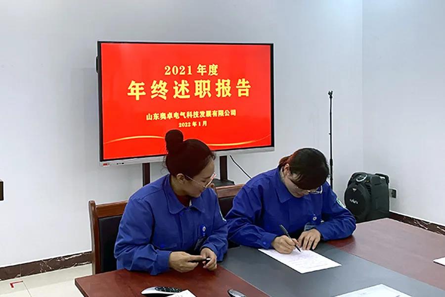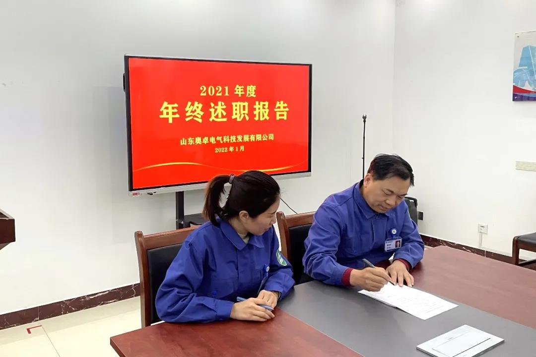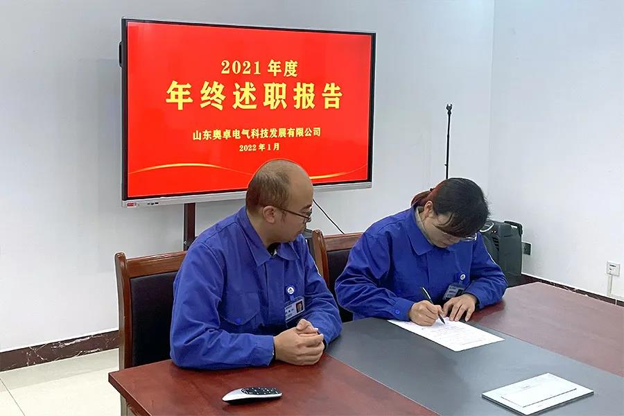 新起點(diǎn)承載新夢(mèng)想,新希望邁向新征程,2022年1月20日,山東奧卓電氣科技發(fā)展有限公司2021年度管理者年終述職報(bào)告會(huì)暨2022年度管理者崗位職責(zé)實(shí)施責(zé)任書簽訂儀式圓滿結(jié)束。奧卓科技董事長(zhǎng)張慶平、常務(wù)副總張曉、副總經(jīng)理婁增磊、總經(jīng)理助理竇金姿出席會(huì)議,公司各部門管理人員參加會(huì)議并作述職報(bào)告。